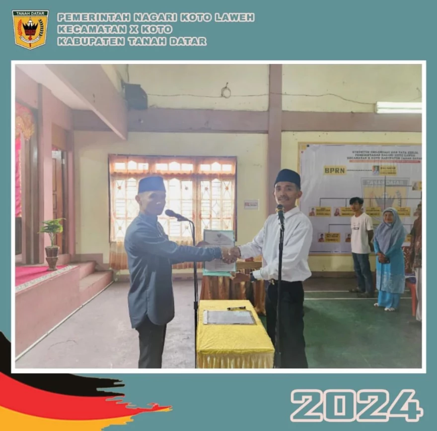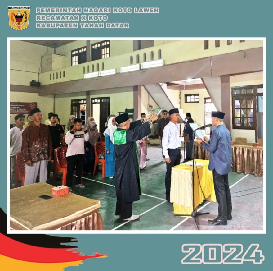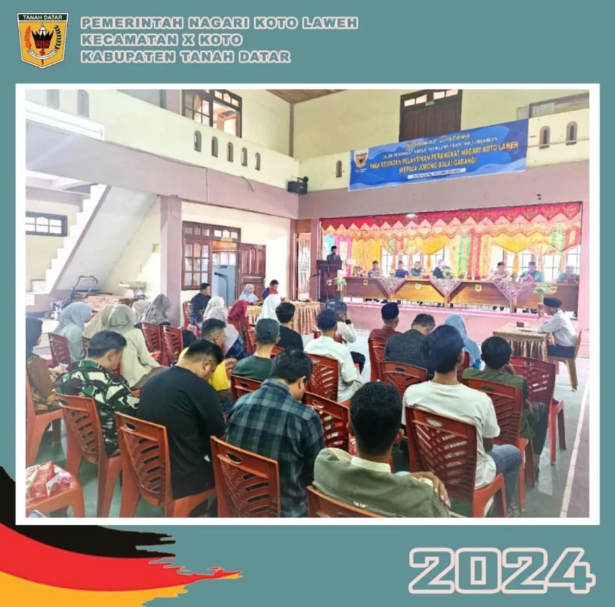Pada hari Jum'at tanggal 09 Agustus 2024, telah dilaksanakan kegiatan pelantikan perangkat Nagari Koto Laweh yaitu pelantikan Kepala Jorong Balai Gadang di Aula kantor Wali Nagari Koto Laweh. Pelantikan ini dihadiri oleh Wali Nagari Koto Laweh Bapak Mulyadi, Sd. Mantari, Ketua Badan Permusyawaratan Rakyat Nagarai (BPRN), Perwakilan Kerapatan Adat Nagari (KAN) Koto Laweh, para jajaran Kecamatan terkait, serta para undangan. Pada pelantikan ini, pelantikan dilakukan kepada Farhan Hafiz untuk melanjutkan memimpin Jorong Balai Gadang ke depan. Semoga dalam kepemimpinannya, Jorong Balai Gadang dapat lebih bersinergi dan berkembang kedepannya.